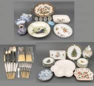 Divers aardewerk en porselein, waaronder: polychroom pauwendecor vaasje, dienblad met tinnen rand, en diverse borden, daarbij: rvs bestekgedeelte met hoornen en benen heften