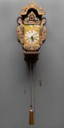 Friese stoelklok, de wijzerplaat met Romeinse cijfers en landschapsschilderingen, de eiken stoel met polychrome decoraties en zeemeerminnen, 20e eeuw -slinger ontbreekt-, 76 x 36 x 25 cm