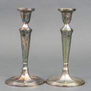 Paar verzilverde achthoekige tafelkandelaars op ovale voet -plaatselijk door verzilvering heen gepoetst-, 28 cm