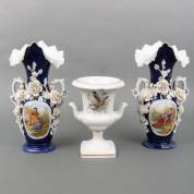 Paar porseleinen vazen met floraal reliëfdecor op blauw fond -defecten-, en urnvormige porseleinen cache-pot met vogeldecor, uitvoering A.K. Kaiser, Duitsland -randchip-, 38 x 21 x 14 cm