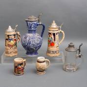 Steengoed schenkkan met tinnen deksel -gerestaureerd-, vier aardewerk bierpullen waarvan twee met deksel, en glazen bierpul met deksel, Duitsland, 33 cm