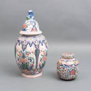 Polychroom gedecoreerde aardewerk kastvaas en een gemberpot, beide uitvoering Tichelaar Makkum -schilfer van binnenzijde deksel kastvaas-, 38 x Ø 20 cm