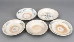 Vijf Chinees porseleinen 'boerenming' borden met blauw-wit decor, 16e/17e eeuw, Ø 22,5 cm