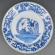 Aardewerk schotel met blauw-wit decor: gans in tuin, Tichelaar, Makkum, eerste helft 20e eeuw -glazuurschilfers-, Ø 44 cm