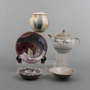 Emma van der Meulen (hedendaags), blauw-bruingeglazuurde keramiek dekselpot, gemerkt, daarbij: grijs-groengeglazuurde keramiek theepot, twee schaaltjes, en raku keramiek wandbordje in diverse kleuren, onduidelijk gesigneerd