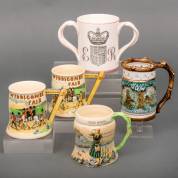 Drie aardewerk bekers met muziekdoos: Fieldings Widdicombe, en Sarie Marais, Crown Devon, Engeland, majolica fopbeker met jachtdecor, en herinneringsbeker Elisabeth 1953