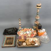 Divers kleingoed, waaronder: polychroom beschilderde houten kandelaars, dienbladen, en Kodak Box camera -defecten-