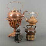 Mahonie theestoof met messing binnenbak, koperen appelketel, twee koperen ketels, blikken lantaarn en messing theelicht