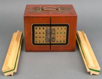 Chinees rood lakwerk kastje met mahjongspel, 20 x 18,5 x 25,5 cm