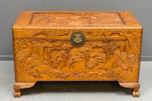 Houten kamferkist met rijk gesneden decor van oogstende boeren, China, tweede helft 20e eeuw, 60 x 105 x 56 cm