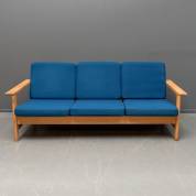 Driezits bank met eiken frame en blauwe bekleding, model 2553, ontwerp Søren Holst, uitvoering Fredericia Stolefabrik, gemerkt -lichte gebruikssporen-, 79 x 190 x 83 cm