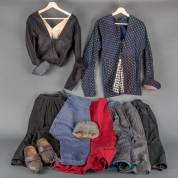 Katoenen klederdrachtkleding, waaronder: rokken en hesjes, paar klompen, en mutsje