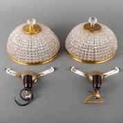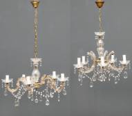 Twee vijflichts glazen pegelkroonlampen, modern -enkele defecte kaarshulzen-