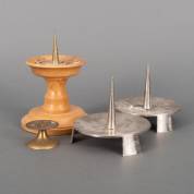 Vier diverse metalen tafelpenkandelaars, waaronder een paar -één pen los, één pen gebogen-, herkomst: kapel Zorgcentrum Tuindorp Oost, Utrecht
