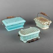 Drie lichtblauwgeëmailleerde gietijzeren stoofjes -corrosie-