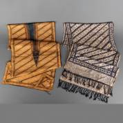 Katoenen batik heupdoek hinggi met centraal een ruitmotief -gaatjes en scheurtjes langs de randen-, en katoenen batik heupdoek hinggi met diagonaal streeppatroon, Java, Indonesië