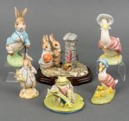 Zes keramische Beatrix Potter-figuren: 'Jeremy Fisher Catches a Fish', 'Peter Rabbit Gardening', 'Jemima Puddle-duck', 'Jemima and her Ducklings', 'Peter Rabbit', en 'Hiding from the Cat', laatstgenoemde staand op houten basement met goudkleurige plaquette, nummer 2428/3500, inclusief authenticiteitscertificaat, alle uitvoering John Beswick, Royal Doulton, Engeland, vijf originele verpakkingen aanwezig