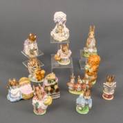 Twaalf keramische Beatrix Potter-figuren: 'Peter Rabbit', 'Mrs. Rabbit', 'Hunca Munca Sweeping', 'Hunca Munca', 'Mrs. Tittlemouse', 'Mr. Jackson', 'Squirrel Nutkin', 'Old Mr. Brown', 'Flopsy, Mopsy & Cottontail', 'Tailor of Gloucester', 'Fierce Bad Rabbit', en 'Lady Mouse', alle uitvoering John Beswick, Royal Doulton, Engeland, inclusief drie verzamelboekjes