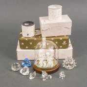 Geslepen kristallen beeldjes: haan, kip, drie kuikentjes, kat, zwaan, egel -snorharen gelijmd- en poedel, alle uitvoering Swarovski, met glazen stolp op houten basementje en twee verpakkingen, en drie ledengeschenken: geslepen blauw kristallen hart, kristallen hart, en presse-papier met SCS logo, alle uitvoering Swarovski, inclusief verpakkingen