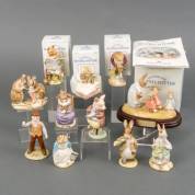 Elf keramische Beatrix Potter-figuren: 'Mr. Jeremy Fisher Digging', 'Ribby and the pattipan', 'Foxy Reading', 'Peter in Bed', 'Mr. McGregor', 'Benjamin ate a lettuce leaf', 'Peter ate a radish', 'The Christmas Stocking', 'Pigling eats his porridge', 'And this Pig had none', en 'Mrs. Rabbit and the Four Bunnies', laatstgenoemde staand op houten basement met goudkleurige plaquette, nummer 152/1997, inclusief authenticiteitscertificaat, alle uitvoering Royal Albert, Engeland, vier originele verpakkingen aanwezig en inclusief verzamelboekje