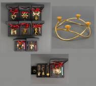 Negen vergulde messing kerstdecoraties, jaaruitgaven 2009 tot en met 2017, vergulde messing 'advent crown' kaarsenhouder, en vier vergulde messing ornamenten: twee hartjes, één engel en een bel, alle uitvoering Georg Jensen, Denemarken, alle in originele verpakkingsdozen