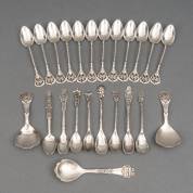 Twaalf 2e gehalte zilveren theelepels met twee bloemetjes en een kevertje aan het uiteinde van de steel, meester: Johannes Albertus Adolf Gerritsen, 1906-1908, daarbij: vijf 2e gehalte zilveren lepeltjes met bloem, vijf verzilverde lepeltjes met het AVRO-logo, ontwerp André Vlaanderen, en een ander verzilverd lepeltje, 11,5 cm