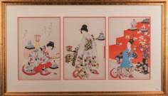 Toyohara Chikanobu (1838-1912), Japanse houtblokdruk triptiek: 'Hinamatsuri', oftewel 'Meisjesdag', uit de serie 'Tokugawa jidai kifujin no zu', oftewel 'Afbeeldingen van edelvrouwen uit de Tokugawa periode', gesigneerd in de druk, 1896-1897, 35 x 75 cm