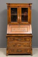 Notenhouten kast met beglaasde opstand en schuingeplaatste schrijfklep, het interieur met ingelegde lades -defecten aan knopjes-, Duitsland, tweede helft 19e eeuw, 199 x 101 x 63 cm