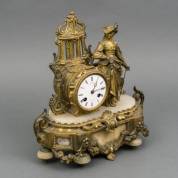 Verguld zamak beeldpendule met flanerende dame, op albasten basement, adres: C. Detouche à Paris, 19e eeuw -gebruikssporen, klepje aan achterzijde en pootje ontbreken-, 33,5 x 33 x 14 cm