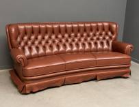 Gecapitonneerde rood lederen driezits bank met licht gebogen zitting, 85 x 200 x 80 cm