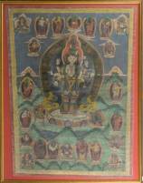 Ingelijste Nepalese thangka: paradijs van elfhoofdige Avalokiteshvara, omgeven door 24 andere boeddha's, bodhisattvas en enkele dharmapala, lijmverf op textiel, 19e/20e eeuw -schimmel aan binnenzijde van het glas-, 70 x 53 cm