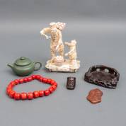 Chinees benen beeldgroep in Japanse stijl, met plaquette: 'Qiushou', ofwel 'Herfstoogst' -defecten-, groene Yixing theepot, roodgekleurd collier, houten basement, maskertje en ring, 23 x 19 x 10 cm
