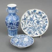 Chinese porseleinen vaas, gemerkt met zegelmerk, 19e eeuw -oren gerestaureerd-, Chinees porseleinen bord, Kangxi -gelijmd-, en Chinees porseleinen roombordje, Qianlong -gelijmd-, 25 cm