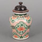 Chinees porseleinen famille verte pot met houten deksel, 19e eeuw, 22 x Ø 13 cm