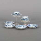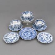 Zes Chinees porseleinen schoteltjes en twee kommetjes met blauw-wit decor: visser in een bootje en visser met net, 18e eeuw -defecten-, schoteltje 2 x Ø 12 cm, kommetje 4 x Ø 7,5 cm