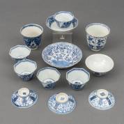 Acht diverse Chinees porseleinen kommetjes, twee schoteltjes, en drie dekseltjes, alle met blauw-wit decor, Kangxi/Yongzheng/Qianlong -defecten-