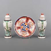 Paar Chinees porseleinen balustervormige dekselvazen met gecraqueleerd polychroom feniksdecor, gemerkt, Nanking, 20e eeuw -een deksel gelijmd-, daarbij: Chinees porseleinen Imari bord met feniksdecor, gemerkt, 20e eeuw, Ø 28 en 31 x Ø 11 cm
