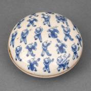 Chinees soft paste zegelwasdoosje met blauw-wit zotjesdecor, Kangxi gemerkt, 19e eeuw -grote chip, en chip aan binnenzijde-, 4,5 x Ø 9 cm