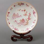 Chinees porseleinen famille rose bord met decor van een rivierlandschap, Qianlong -haarlijnen-, daarbij: houten bordenstandaard, 4 x Ø 22 cm