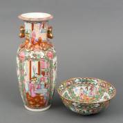 Chinees porseleinen famille rose vaas, en Chinees porseleinen famille rose kom, beide Kanton, 20e eeuw, 34 cm