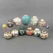 Diverse Chinees porseleinen en steengoed gemberpotten met diverse decors, 20e eeuw -ontbrekende deksels-, 16 cm