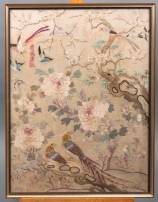 Ingelijste geborduurd zijden doek: vogels tussen bloemen, met gelukswens in Chinese karakters, China, 20e eeuw -waterschade-, 50 x 38 cm