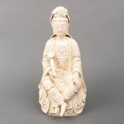 Blanc de Chine beeld: zittende Guanyin met ruyi-scepter in haar rechterhand, een afbeelding van Amitabha in haar bloemenkroon, tweemaal Dehua gemerkt, modern -restauratie wijsvinger, chipje van mantel-, 42 x 20 x 20 cm