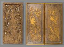 Twee deels gebronsverfde houtsnijwerken: vogels tussen bloemen, en Rama op de schouders van Hanuman, Zuidoost-Azië, 68 x 59 cm