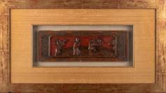 Chinees meubelpaneel met gestoken decor: twee figuren op een terras -defecten-, 12,5 x 36 cm