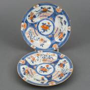 Paar Chinees porseleinen Imari borden met floraal decor in drie cartouches, gemerkt met bloem, begin 18e eeuw -één bord defect, ander met randschilfer-, Ø 22,5 cm
