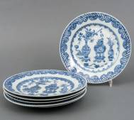 Serie van zes Chinees porseleinen borden met blauw-wit bloemenvazendecor, Qianlong -defecten en restauraties-, Ø 23,5 cm