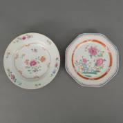 Twee diverse Chinees porseleinen famille rose borden met florale decors, 18e eeuw -één bord met defecten, de ander met fleabite langs de rand-, Ø 22 cm