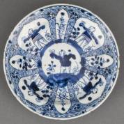 Chinees porseleinen schoteltje met blauw-witte zotjes in cartouches, Kangxi -randchips en haarlijn-, Ø 16 cm