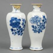Paar Chinees porseleinen balustervormige vaasjes met blauw-wit bloemdecor, Kangxi -beide halzen gerestaureerd-, 12 cm